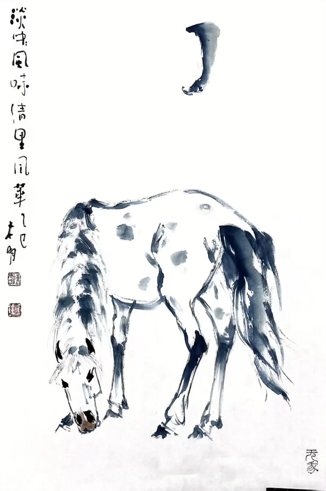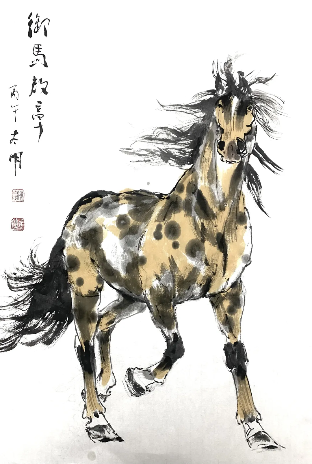 与太明兄几十年的往来中,感受到他就是具有一身傲骨。他笔下大写意中的每一匹马无不落笔有神,结构精准。他在强调写神,但并不忽略形似,而是力求神形兼备。正如郑板桥在总结他的经验时曾说:“石涛画兰不似兰,盖其化也,板桥画兰酷似兰,犹未化也,盖将吾之似学古人之不似。”从这句话里我们可以看出太明追求的正如板桥所言的这种神似,是在酷似的基础上变化出来的,从酷似到“不似”(也就是神似),是画家对所描绘的对象经过高度的提炼,有机的慨括和合理的剪辑,才能达到的神形兼备的境地。