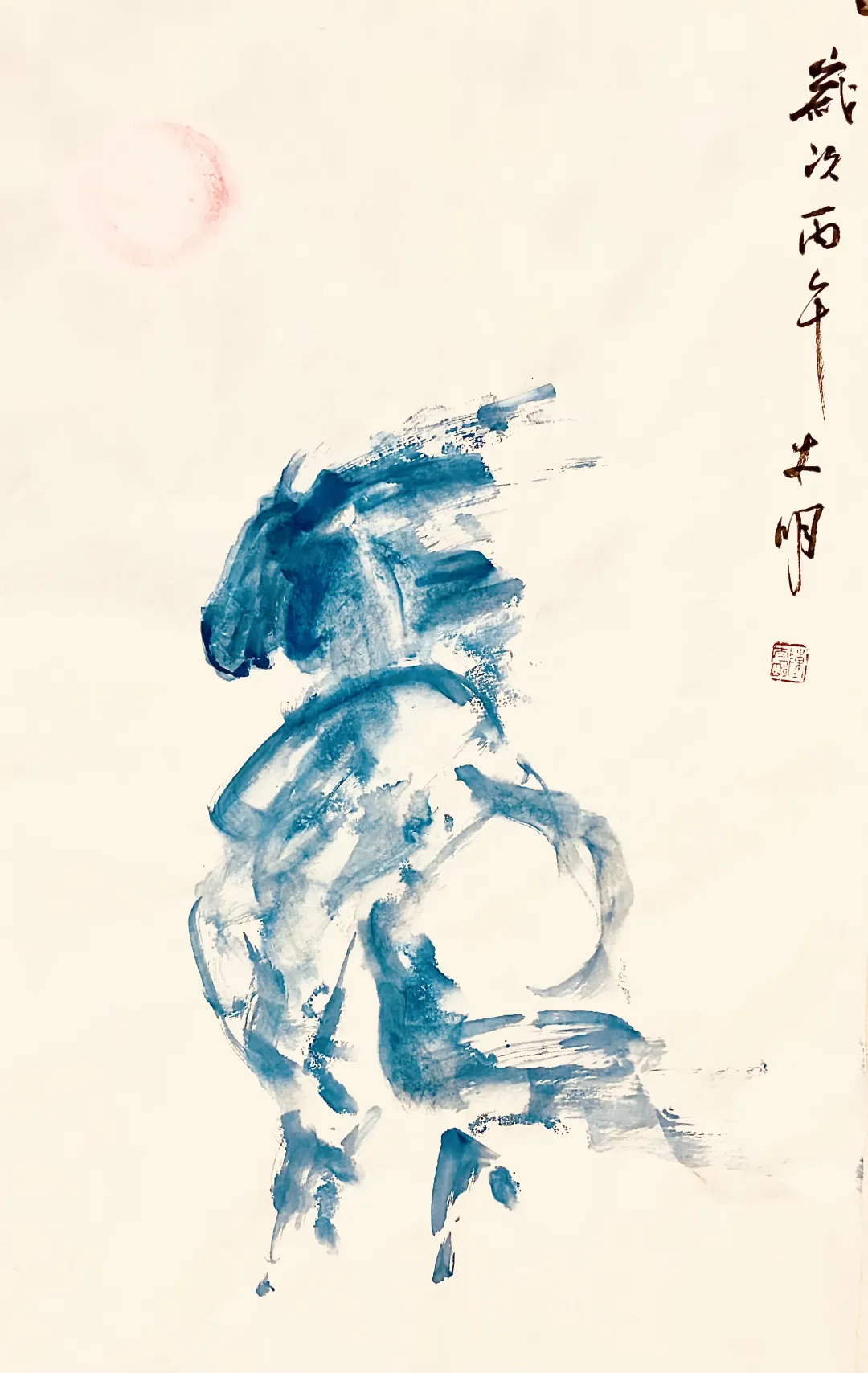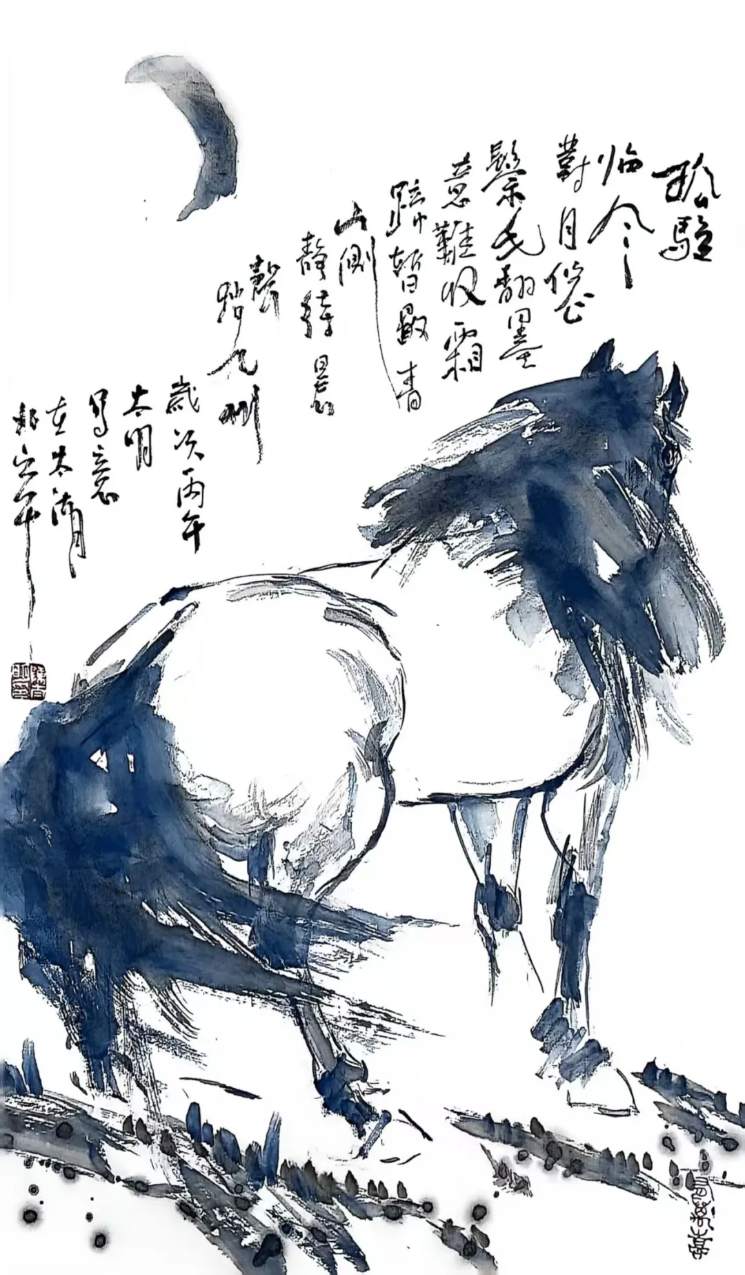 太明先生画马作品可分为“动境”与“静境”两类。动境之作如《草原雄风》,《驷马难追》,群马奔腾的画面中,背景以淡墨扫出的云烟、尘土,与奔马的动态形成呼应,营造出万马奔腾、气吞山河的雄浑意境,传递出蓬勃的生命活力与豪迈的民族气魄;静境之作如低头饮水的单马图,画面留白居多,仅以简洁的花青色勾勒马的形态,那背景的空灵让画面生出静谧,那悠远的一弯勾月,那似与不似的奇巧笔意;真的需要写意里一辈子的功夫!写意画从宋代始无论有多繁的画,全都注重一个“巧”字。太繁无序则平,太简则空,在这点上太明先生在“简繁”所能表达的可能性上做了一个很好的尝试。“计白当黑”的传统美学,在他的“马作”中多多少少让人感受到了一点哲思意味。