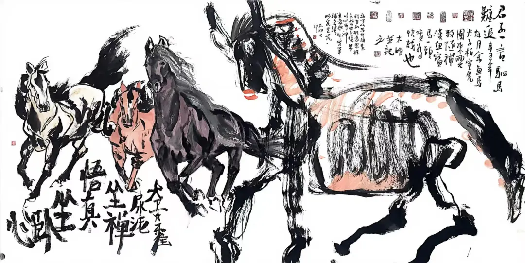 纵观太明的部分《马作》还会让人感觉到他那強烈的个人情感与人文思考,或民俗的,或当代精神的,这与他能书会写是有一定关系的,他是一位优秀的书法家,但他从没这样看待过自己,他总是说他只是一个会写字的,看他题款中的诗词与书法,往往都是与画面中的骏马相互呼应的又具特殊意味的,在他的画里很少见有“看图说话”程式,他十分注重文字的意境与笔墨的意象合而为一的传达,画面中所呈现出来的趣,诗,文,书,是让其作品的精神内涵得以丰厚的主线。这种“诗书画印”的结合,既回归了传统文人画的审美范式,又让画马作品的精神表达更具层次感。