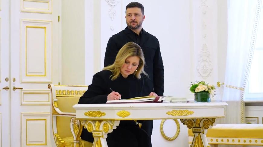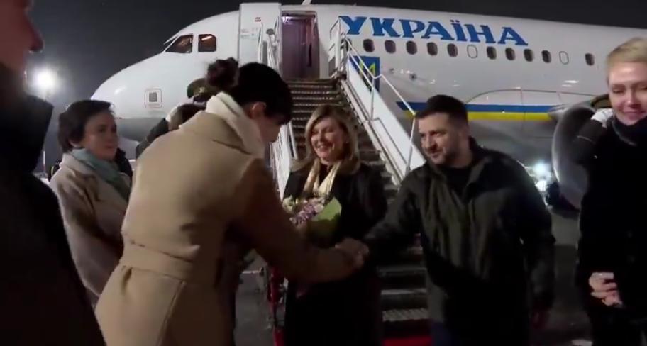也许是奥莱娜好久没有和老公一起出国访问了,所以这次抵达立陶宛机场,现场还有两位送花的女士,把美丽的鲜花都送给奥莱娜了,当时的乌克兰第一夫人奥莱娜一下收到两束花看起来非常开心,更加让小伙伴们惊喜的是,立陶宛除了在机场给泽连斯基和夫人举行高规格的欢迎仪式之外,在立陶宛总统府也给了泽连斯基和夫人更高的迎接仪式。