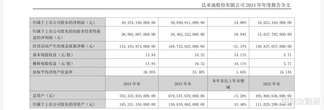 去年,比亚迪归属于上市公司股东的净利润为402.54亿元,同比增长34%;扣非后净利润为369.83亿元,同比增长29.94% 。