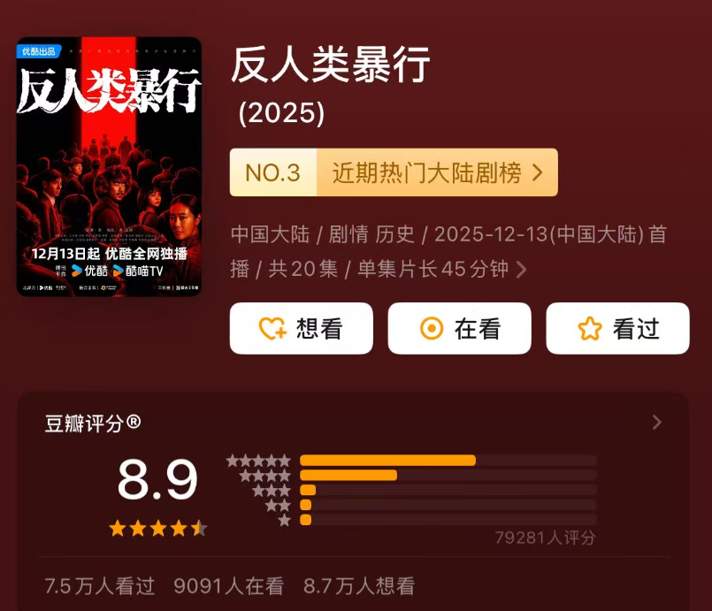 《反人类暴行》的好成绩,除了内容本身过硬之外,也与它恰好承接了捍卫真相、揭露黑暗的公共情绪有关。这种先社会情绪半步的创作思路,在优酷的许多精品内容中都有具象体现。