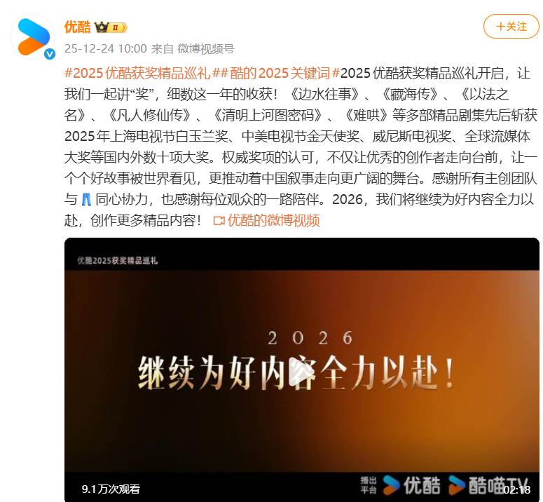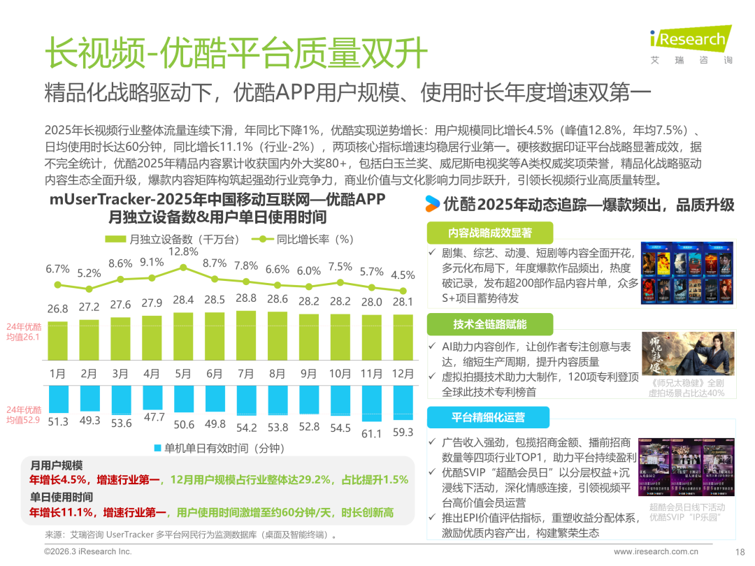 而就在行业整体承压的背景下,优酷交出了一份逆势增长的成绩单,为行业注入了一剂强心剂:3月12日,艾瑞咨询发布《2025中国移动互联网流量年度报告》。报告显示,受精品化战略驱动,优酷实现逆势增长,用户规模同比增长4.5%,日均使用时长达60分钟、同比增长11.1%,两项核心指标增速均居行业第一。