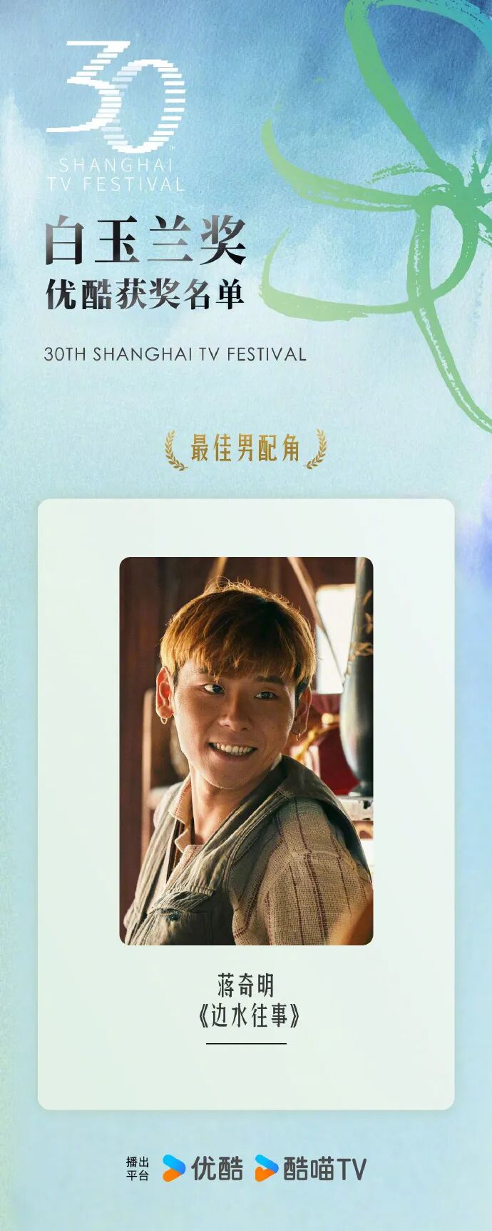 上海电视节白玉兰奖,与飞天奖、金鹰奖并称业内三大奖项,在《边水往事》中表现惊艳的年轻演员蒋奇明凭借该剧拿下白玉兰最佳男配角奖。
