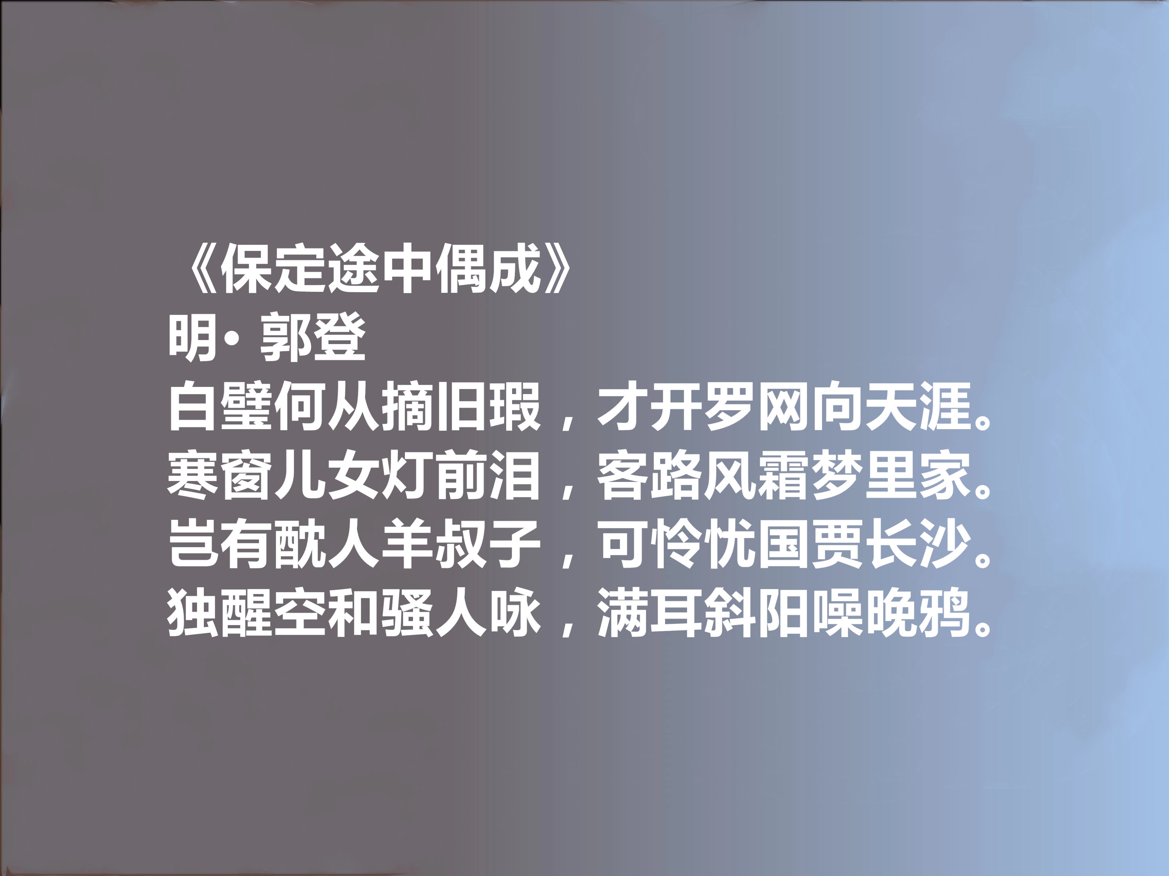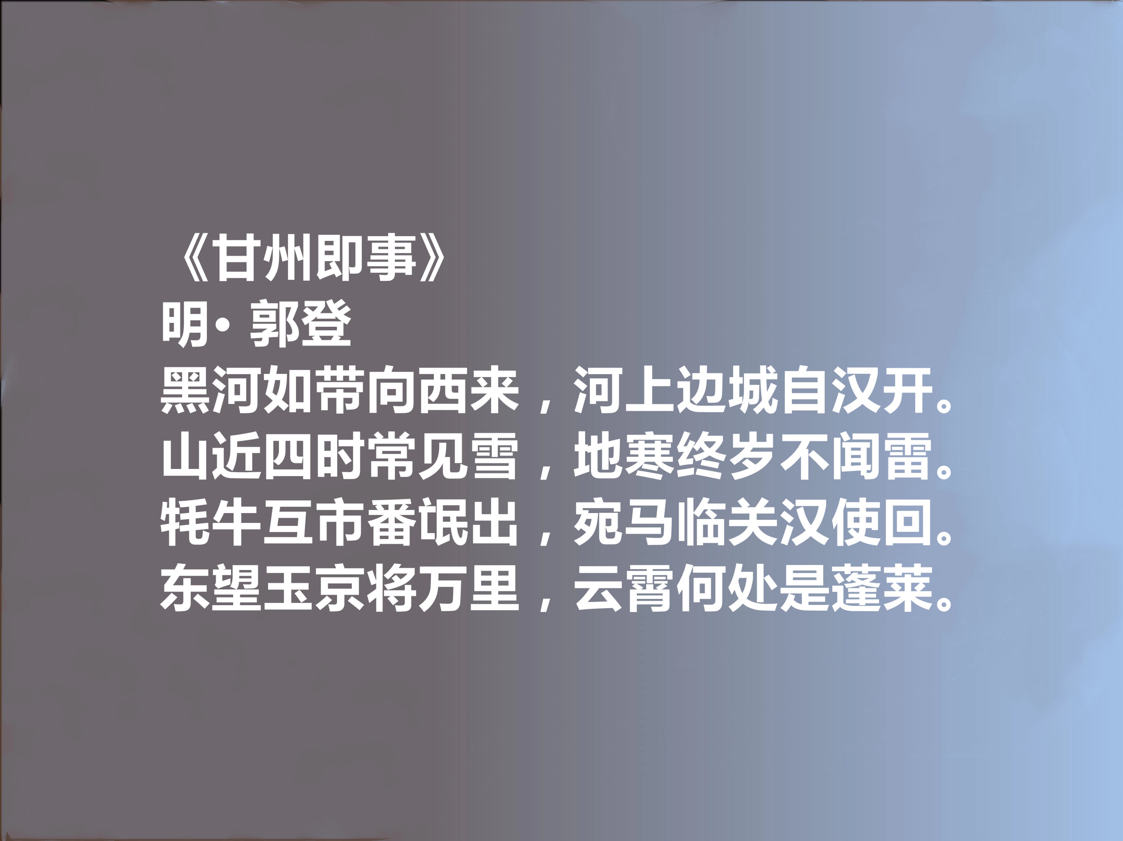 他的诗歌思想兼具爱国情怀、边塞豪情与人生感慨,既饱含“誓扫匈奴不顾身”的报国之志,也有“客中春晚倍思乡”的贬谪之愁。艺术上,其诗或沉雄浑厚、或委婉生动,如《甘州城西》“甘州城西黑水流,甘州城北黄云愁”,以苍凉意象勾勒边塞风光,被袁嘉谷赞为“唐四家具体而微”;分类上则涵盖边塞诗、咏物诗、送别诗与怀古诗,边塞诗如《经旧战场》悲叹战乱之苦,咏物诗如《萤》寄托爱憎,送别诗如《送人回京》抒发愁绪,每一类都独具特色,成为明代诗歌中武将文人双重身份的鲜活注脚。