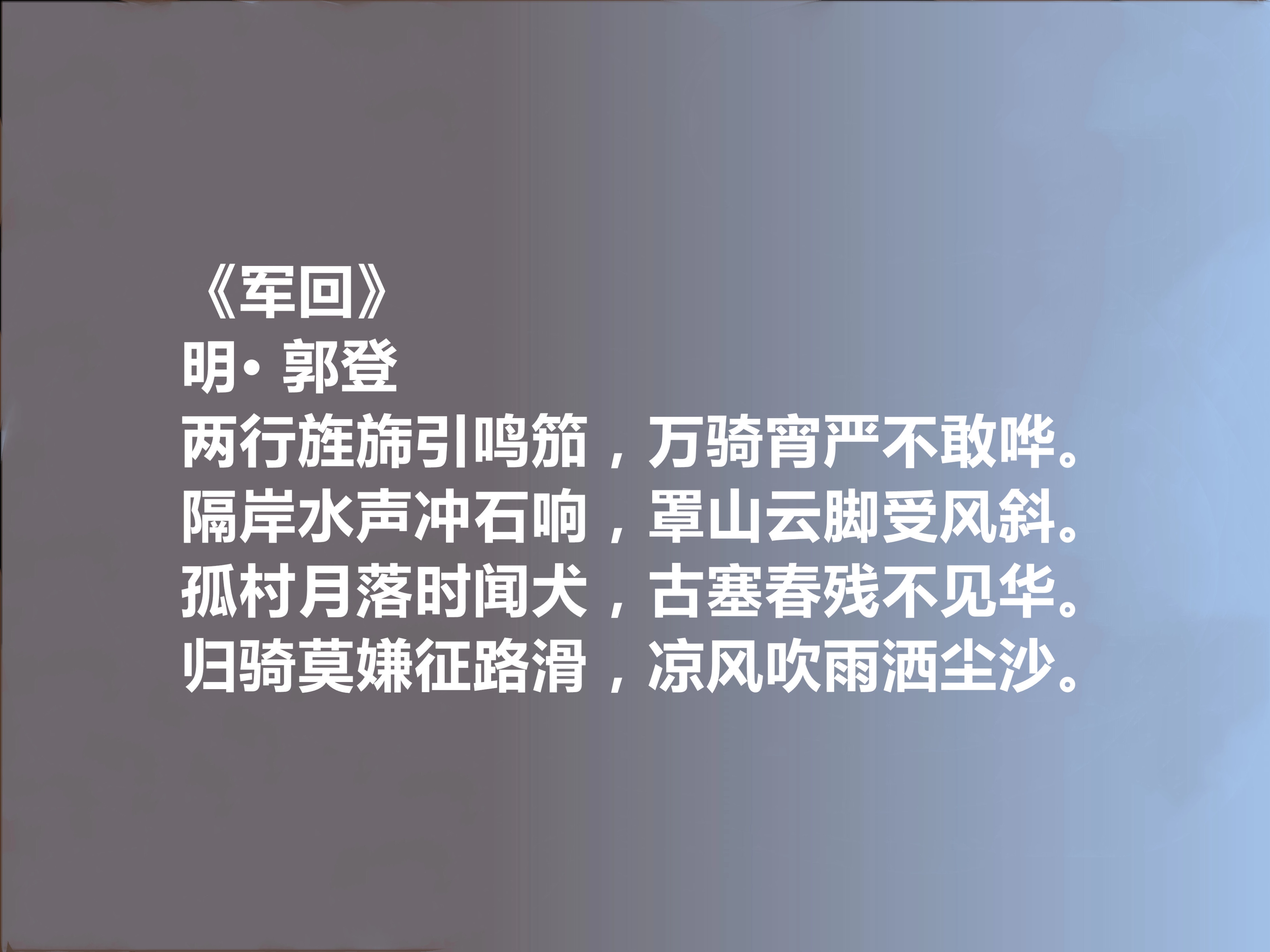 总的来说,郭登以武将之身挥毫泼墨,用诗文记录烽火岁月,其作品既是明代边患历史的见证,也是文武交融文化精神的体现。他的诗歌打破了文臣与武将的创作壁垒,为后世留下了兼具刚健与温情的文学瑰宝,至今仍能让读者在字里行间感受到那位古将星的铁血丹心与诗意情怀,下面我们来欣赏他的十首诗吧!