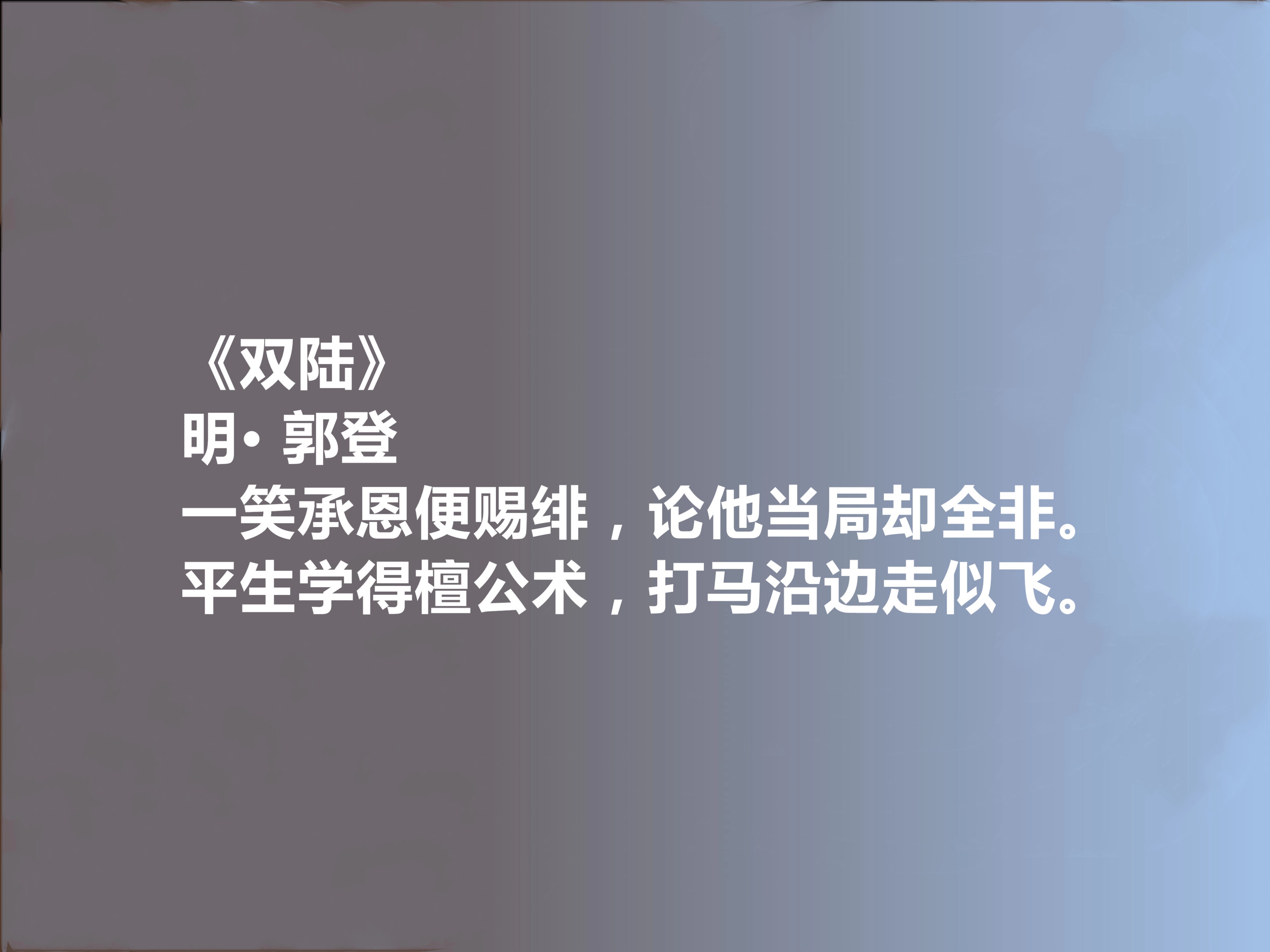 据是资料记载,郭登于“土木堡之变”后镇守大同,以八百骑兵大破瓦剌数千之众,凭智勇筑牢北疆屏障,官至定襄伯、中军都督府掌事,获谥“忠武”;他不仅仅是一位武夫,在文坛上,他打破武人无文的偏见,其诗兼具金戈铁马的刚健与风花雪月的灵秀,语言平易却意蕴隽永,既有唐人遗风,又含边塞真味,为明代诗歌注入了慷慨苍凉的刚健之气。