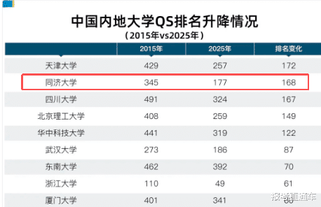 以全球参与度最广的QS世界大学排名为例,在2015至2025这十年间,中国高校经历了一场深刻的“位次洗牌”。一批工科特色鲜明的大学展现出强劲的上升势头。而在这份“进步榜”上,同济大学从全球第345位攀升至第177位,跃升168个位次,进步幅度位居全国高校前列。