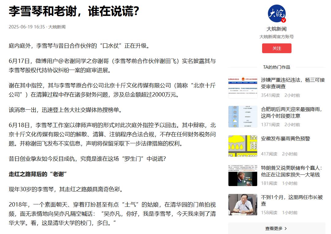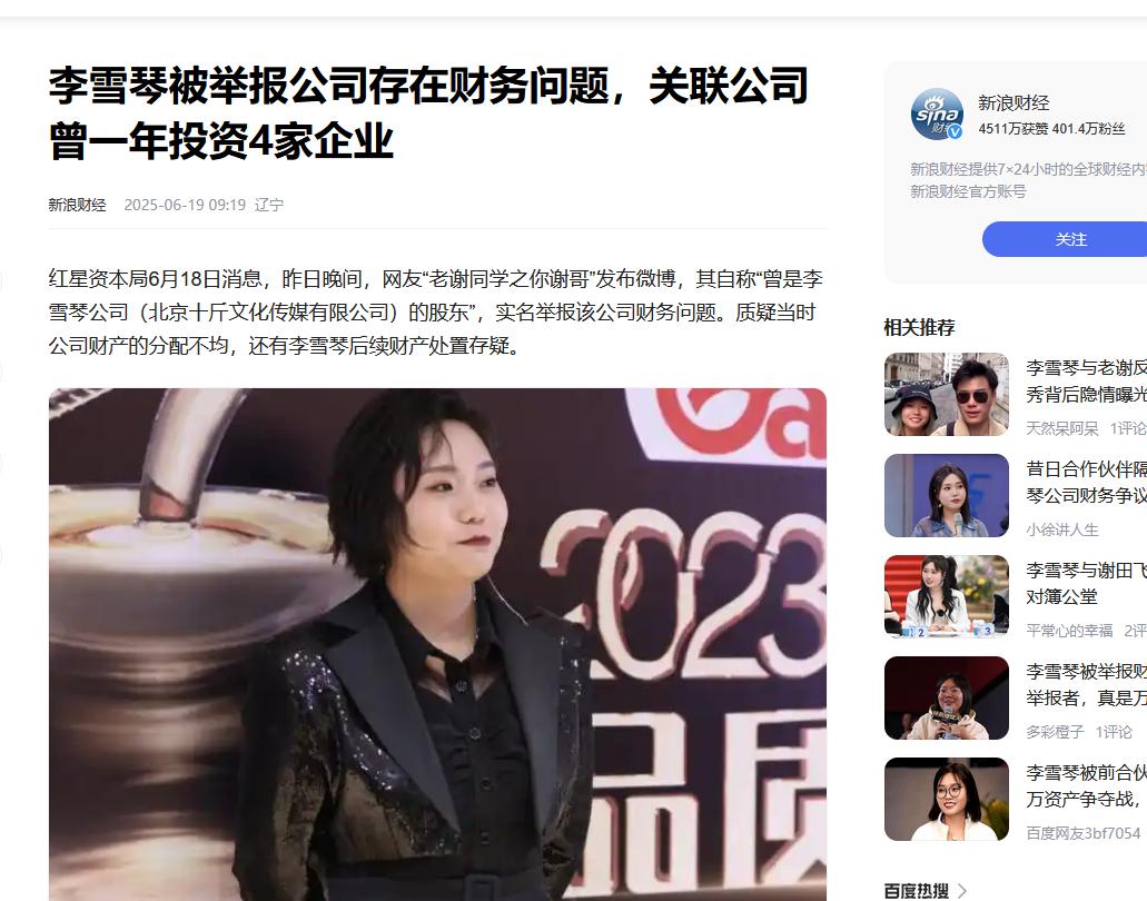 6月17日,谢田飞实名举报李雪琴,揭露两人合伙开公司后,因为经济分配问题产生巨大矛盾,最终不得不走上法庭。