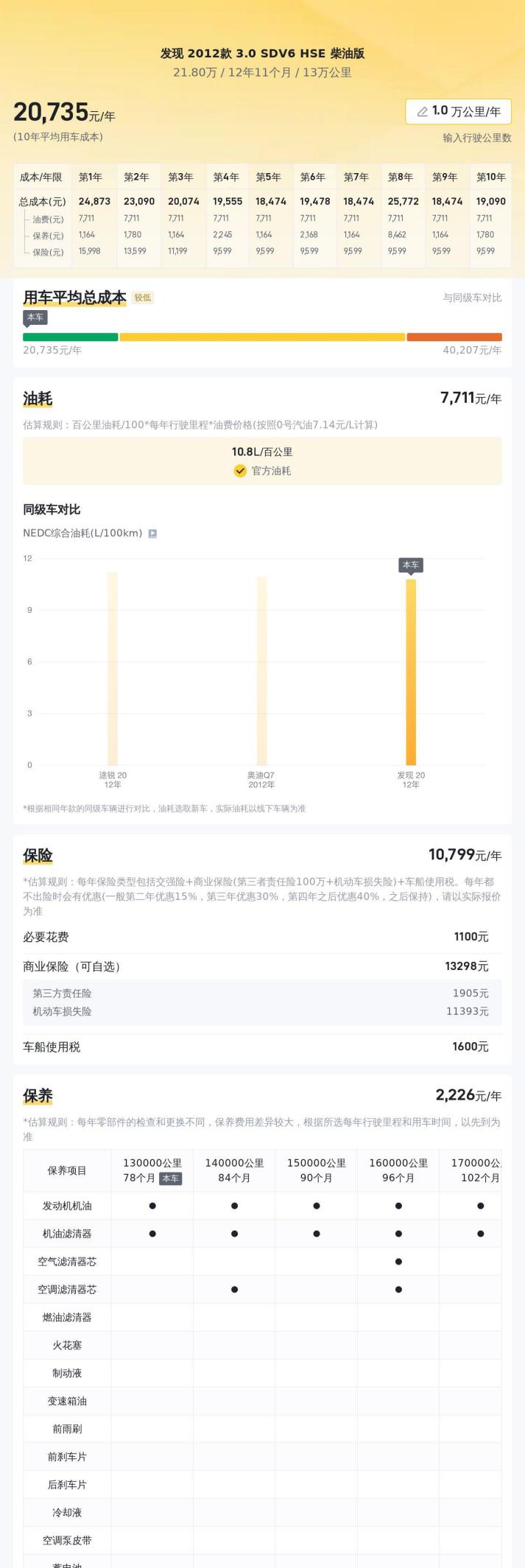 我们不妨来算一笔账。根据一些汽车网站的数据,同级别豪华SUV的十年平均用车成本大约在2万到4万之间,这辆发现的用车成本大约是2.1万/年,处于中等水平。但这仅仅是平均值,实际情况会因个人驾驶习惯、路况、保养情况等因素而有所差异。如果后期出现一些大的故障,维修费用可能会超出你的预期。
