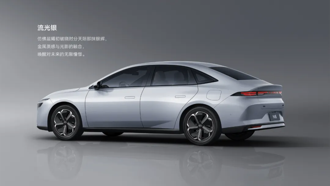 车身侧面采用风弧式极简腰线,从车头延伸至车尾勾勒出修长姿态,搭配运动化轮辋,呈现出沉稳兼具动感的视觉效果;车尾配备飓风之眼尾灯,整体布局方正规整,增强了尾部的视觉表现力。不仅如此,N6的车身还采用0.618的黄金车身比例,可以实现0.248Cd的超低风阻。