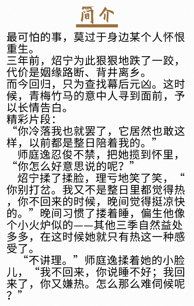 当一切回到最初,她懂得了那些总是欲言又止的眼神,那些不同寻常的举止,还有……他的心意。本文剧情丰富,一波三折,宫斗宅斗让人烧脑。作者文笔俱佳,斐然的文采令作品增了三分的耐人寻味,第一人称,更能让读者切身体会主角一波三折的心情。全文都有点带悲的色彩,虽然也不乏一些甜蜜的情节。