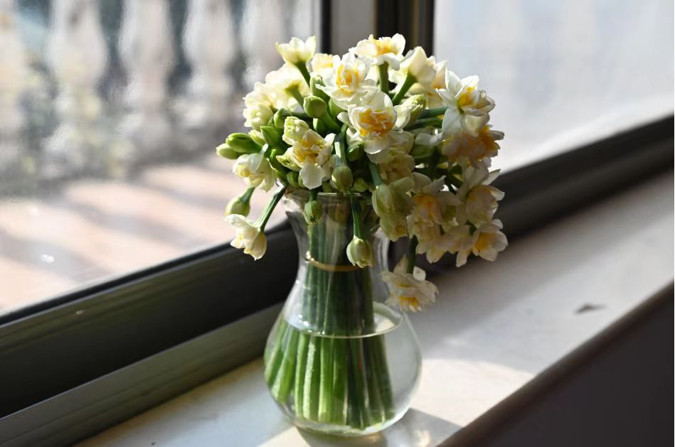 走进种植大棚,嫩绿叶片亭亭玉立,“五福临门”“六六大顺”“八仙过海” 等寓意吉祥的盆栽整齐排布。其复瓣花型润白似玉,俗称 “玉玲珑”,花香浓郁持久,无需雕刻便可绽放,花期最长可达 40 天,是冬日里的 “颜值担当” 与 “报春使者”。依托传统技艺,合作社打造出年宵花礼盒、商品水仙球、鲜切花等多元产品线,让古韵芬芳点缀生活。