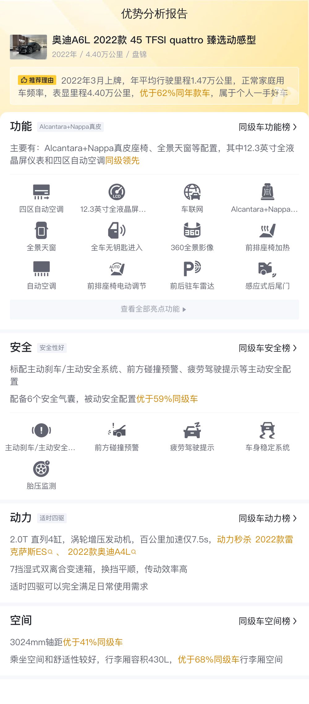 奥迪A6L作为豪华B级车市场的一款重要车型,其发展历史可以追溯到1968年。当时,奥迪100(C1)的诞生标志着奥迪A6L系列的开始。经过几十年的发展和迭代,奥迪A6L已经发展到了第九代。在中国市场,奥迪A6L于1999年首次引入,并在第二代国产奥迪车型中占据了重要地位。从此,奥迪A6L凭借其卓越的性能和豪华的配置,成为了中国豪华B级车市场的领军车型之一。今天我们就为您带来一辆二手奥迪A6L,具体版本为奥迪A6L 2022款 45 TFSI quattro臻选动感型。