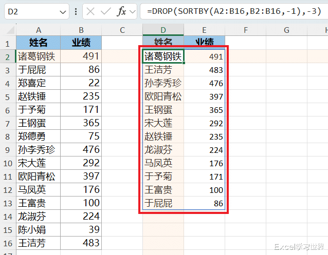 公式表示将第一个参数的区域的最后 3 行删除,即删除业绩最小的 3 行。
