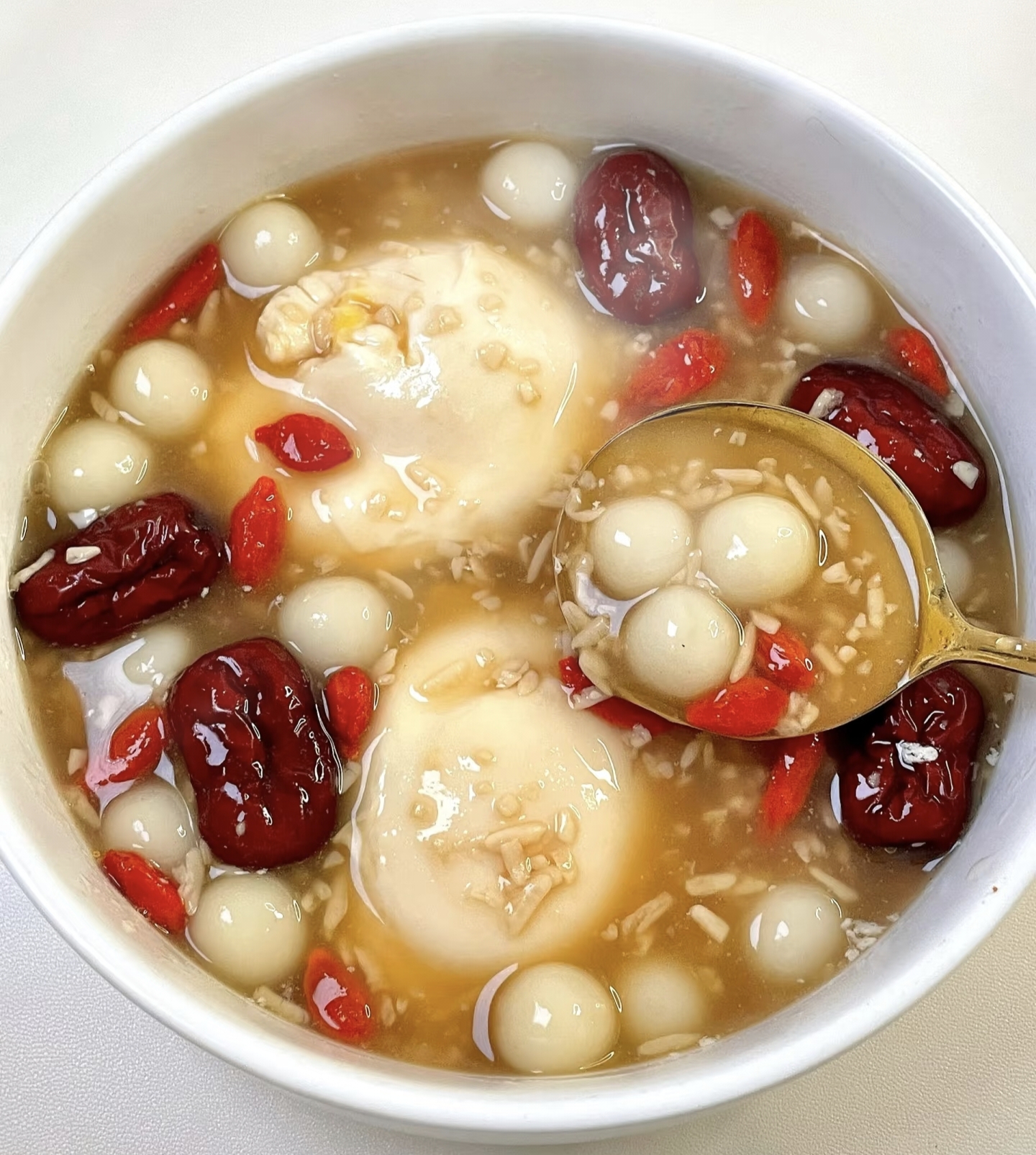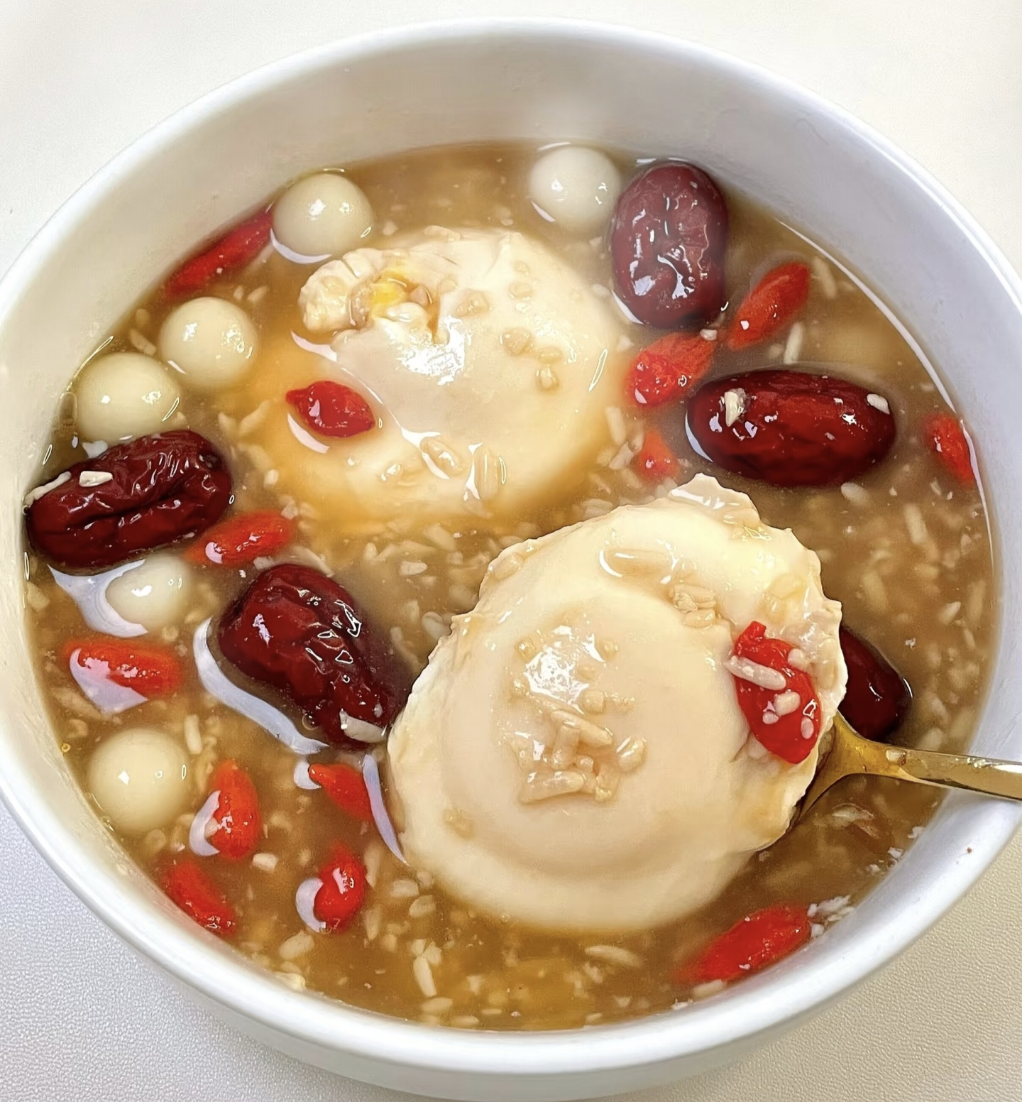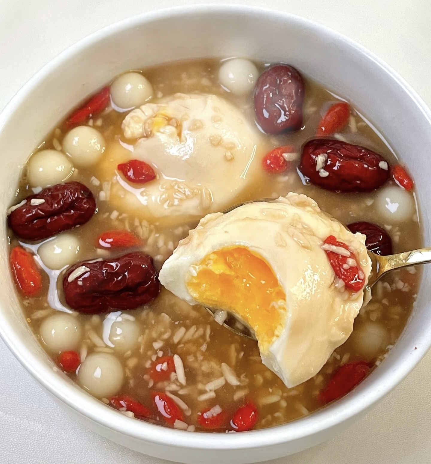 最后,把之前煮好的糯米小圆子倒进锅里,再撒上一把枸杞。枸杞不用煮太久,稍微煮个一分钟,让它变软就行。这时候,一碗热气腾腾、香气扑鼻的红糖酒酿鸡蛋就大功告成啦!