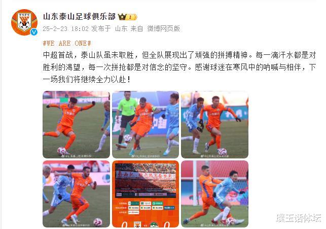 傍晚18点,山东泰山队通过官方渠道发布声明:尽管首战未能取胜,但全队在比赛中展现出了顽强不屈的拼搏精神。每一滴挥洒的汗水,都饱含着对胜利的热切渴望;每一次奋不顾身的拼抢,都是对信念的执着坚守。泰山队还特别感谢了在寒风中不离不弃、呐喊助威的球迷们,并表示下一场比赛将继续全力以赴,不辜负球迷的期望。