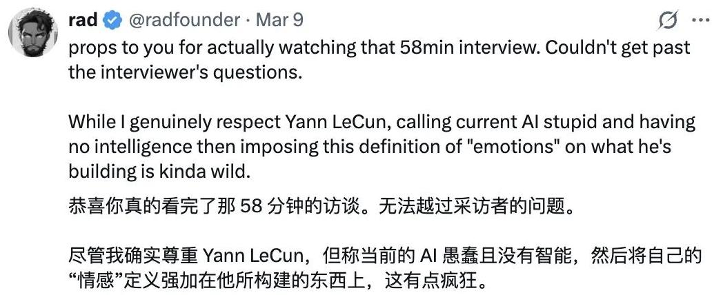 再往下看,才发现这是Yann LeCun在一场访谈中的发言。