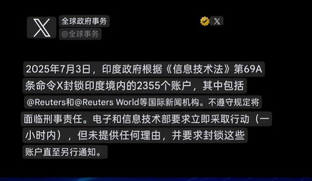 第6条消息:印度政府下令社交平台封锁印度境内2355个账户,其中包括路透社等国际新闻机构。