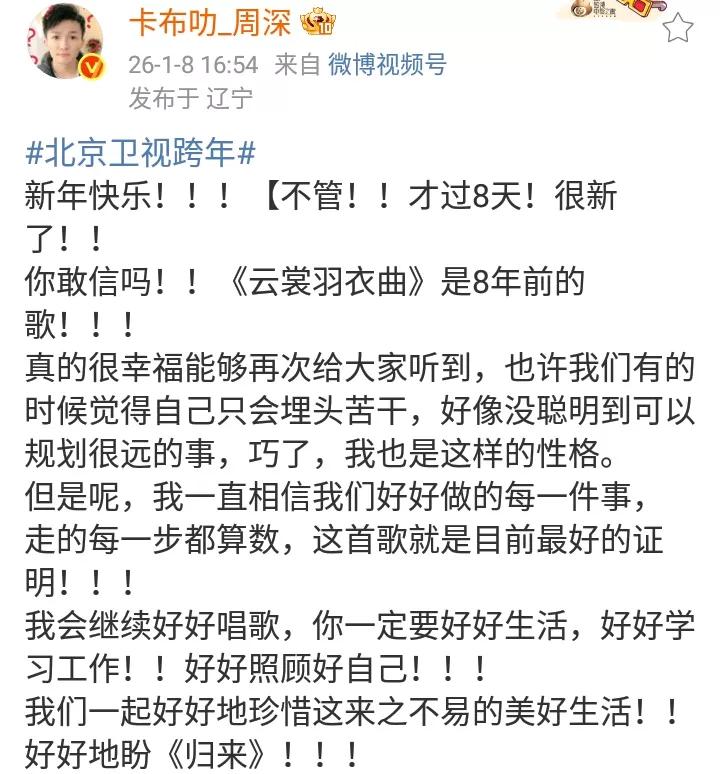1月8日这一天下午,歌手周深发文,表达了自己参加央视跨年晚会的美好感受!