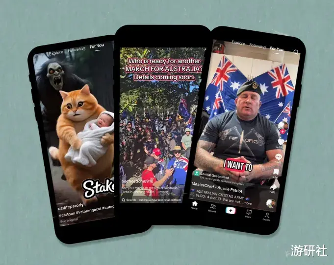 未登录的TikTok用户,能看到的有左图中一段博彩公司的AI生成广告,以及中右图里的反移民集会