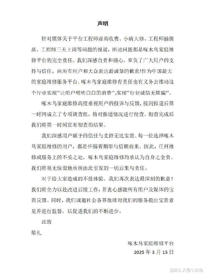 2025年3月15日,央视315晚会再次曝光了啄木鸟维修平台乱象,包括平台工程师虚高收费、小病大修、工程师抽佣高、工程师三天上岗等问题;