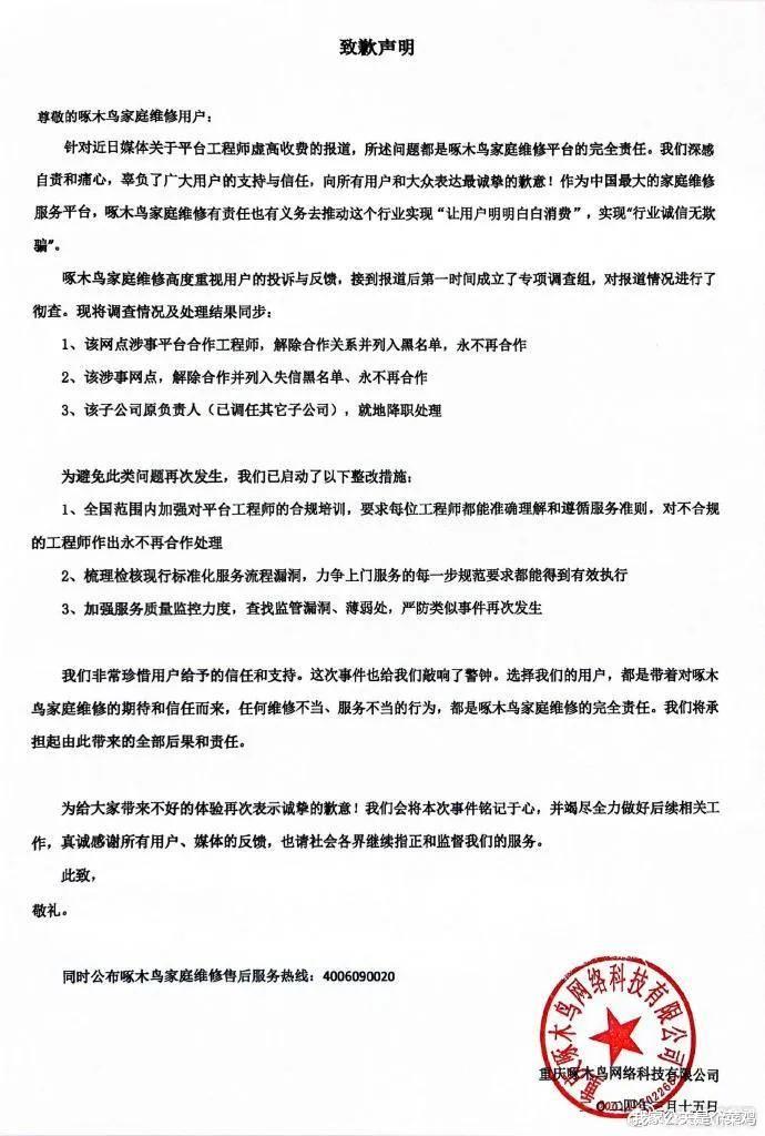 在各界压力之下,啄木鸟维修只能选择直面问题,当日凌晨发布第二份公关声明,承诺每天发布一条整改声明,每天公开一项整改进展,并且真的执行了。