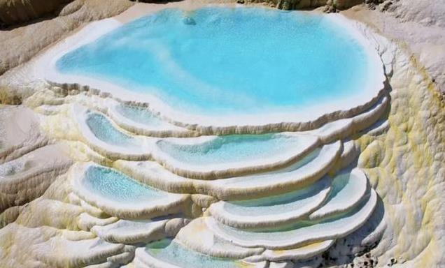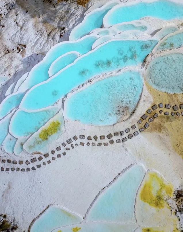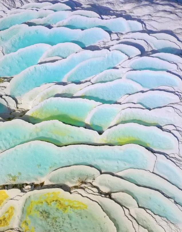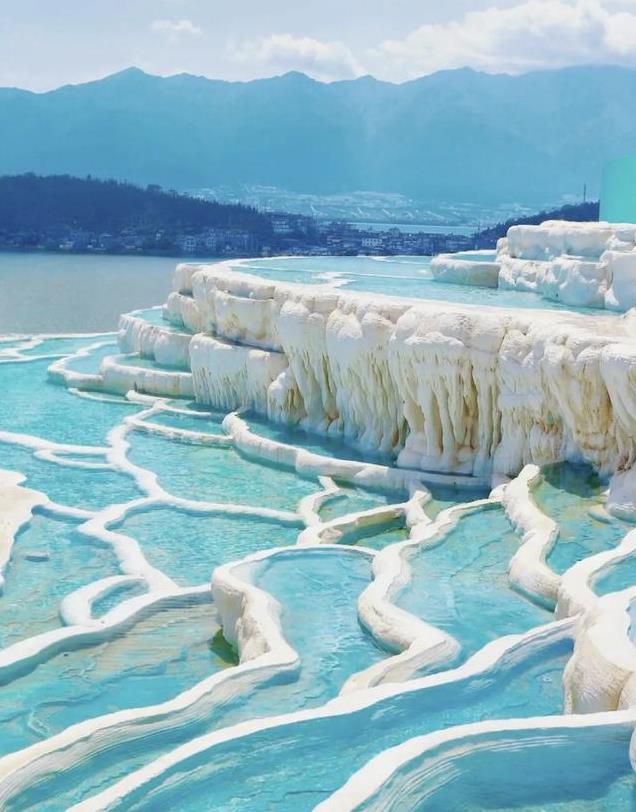 就像一座白色的城堡,层层白雪??,梯田堆叠,错落有致,洁白如雪的碳酸钙梯田,在阳光??的照耀下闪烁着银光,像一层层奶油蛋糕,宛如梦幻般的仙境,拍照超级出片!