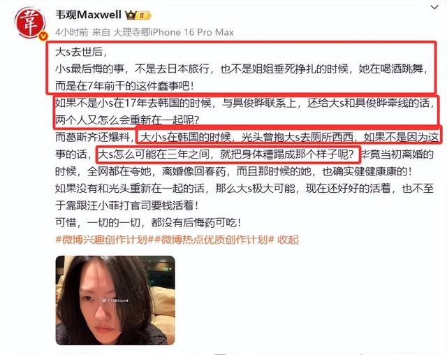 而该博主继续抖猛料称,大S与具俊晔重新在一起,也并非是“缘分”,而是因为早在2017年,大S与汪小菲的婚姻存续期内,小S就到韩国,帮大S跟具俊晔“牵线”,才让两人最终走到了一起。