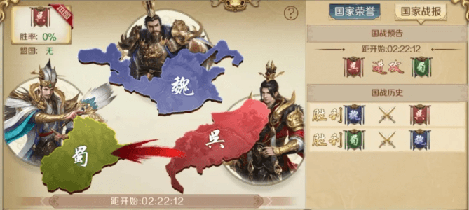 基础规则:1.国王、王后、丞相、大司徒可以宣战。2.国战宣战需要消耗国库资金。3.每个国家每周只能被宣战多2次。4.宣战后第二天20:00开始战斗,20:00-20:30为国战时间。5.盟国可以协助进行国战。6.国战胜利方可以掠夺失败方国库10%资金