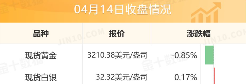 因白宫免除了一些智能手机和电脑的高额关税,市场风险情绪有所改善。现货黄金有所回调,盘中一度跌超1%,并失守3200美元大关,但 随后又收复部分失地,最终收跌0.85%,报3210.38美元/盎司。现货白银在32美元附近震荡,最终收涨0.17%,报32.32美元/盎司。