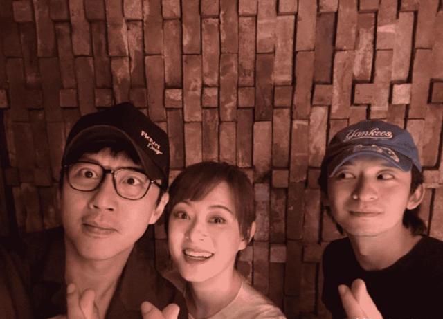 帽子上的白色字母标识,为他的整体穿搭增添了一丝潮流感,深色的短袖简约大方不做作,他跟这两夫妻比出的手势,有点随大流的意味。