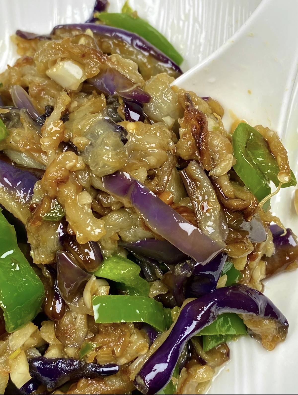 热锅凉油,是这道菜的第一步。油温五成热时,放入姜蒜爆香,浓郁的蒜香瞬间弥漫开来,勾人食欲。接着,倒入沥干水分的茄子丝,转中大火快速翻炒。茄子丝在锅中与热油相遇,发出“滋滋”的声响,逐渐变得软塌,边缘微微焦黄。此时加入一勺生抽,沿着锅边淋入,高温激发出酱油的酱香,让茄子丝均匀上色。翻炒约两分钟,茄子丝八分熟时,倒入青椒丝,继续翻炒至断生,让青椒的清鲜与茄子的绵密相互交融。