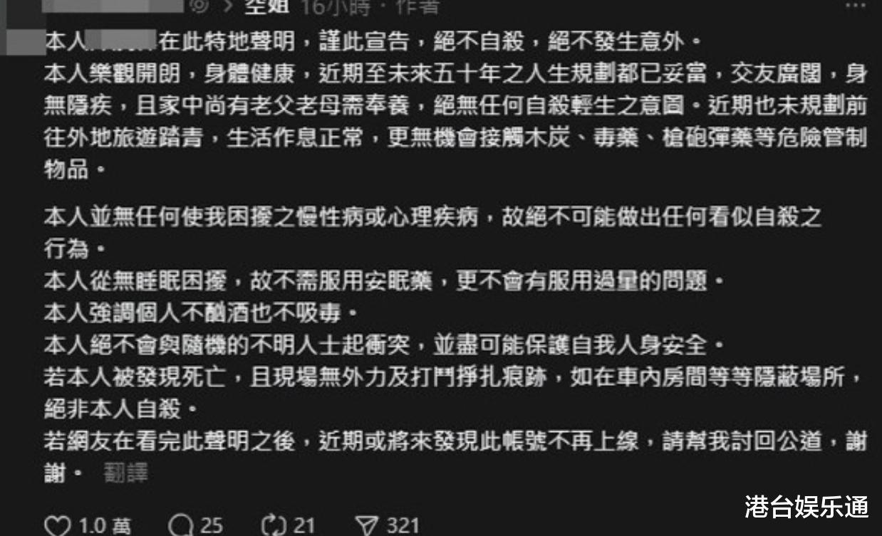 不久后,该网友还发出了所谓的“不自杀声明”,强调自己没有轻生的念头,没有任何心理或精神上的疾病,近期也没有规划出游,更没有接触木炭以及某些危险物品,如果去世一定是被杀。
