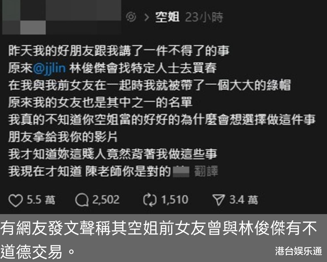 根据该网友的说法,林俊杰经常找特定异性进行不道德交易,自己那身为空姐的前女友也是其中一员,且有视频为证。下图为相关报道截图: