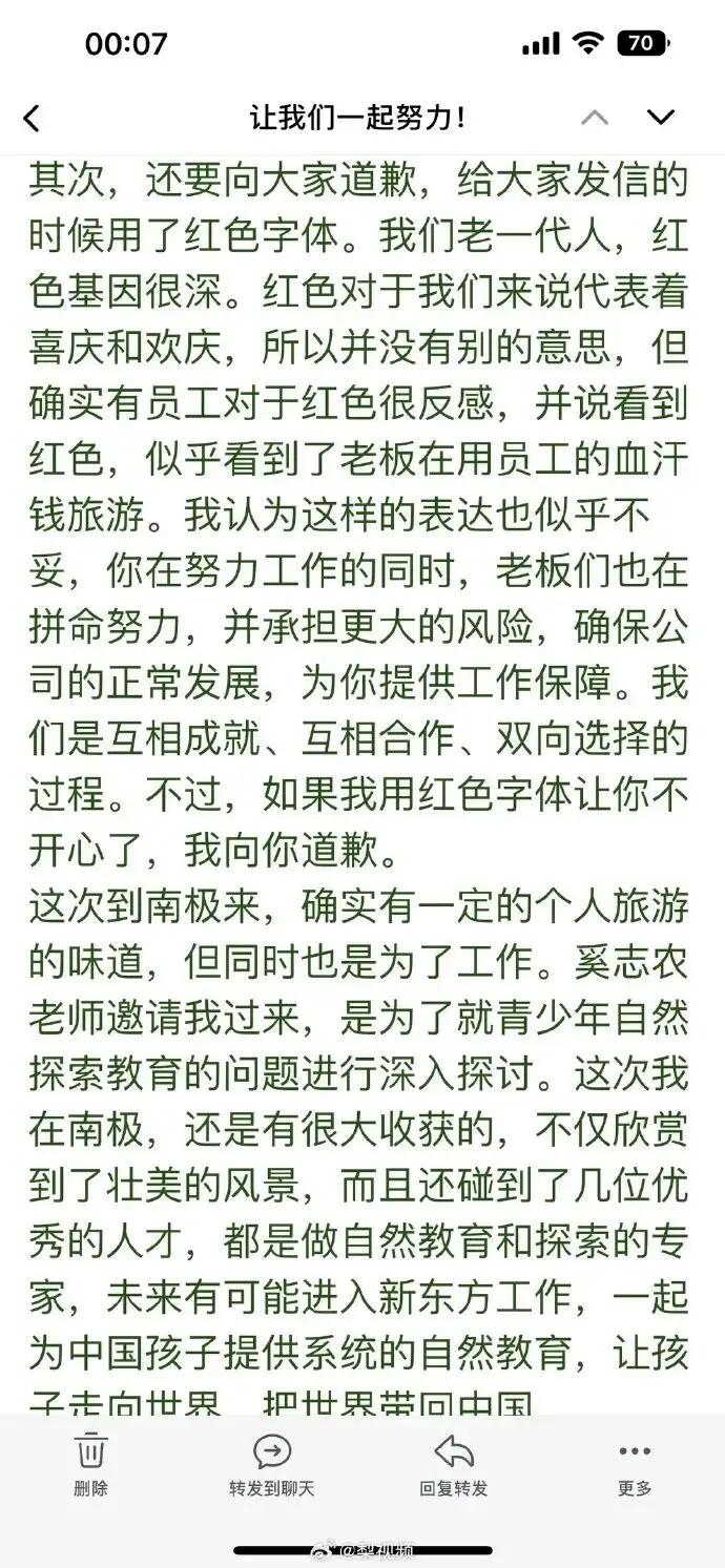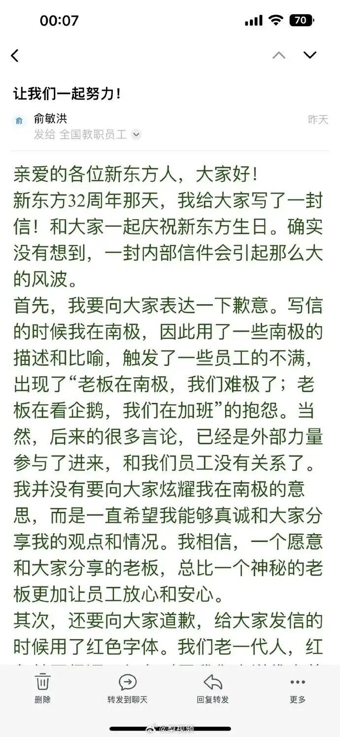 这番表态,与数月前俞敏洪因一封“南极内部信”陷入舆论风波时的情境,形成了微妙对比。当时,正值新东方成立32周年,俞敏洪在南极发出内部信,以“冰雪中的坚守”为主题展望未来。然而,信中对南极之行的描述,却意外引发了部分员工和网友的“不共情”。有人调侃“老板在南极看冰山,我在出租屋看数字”,认为信中缺少对员工当下压力的体察。