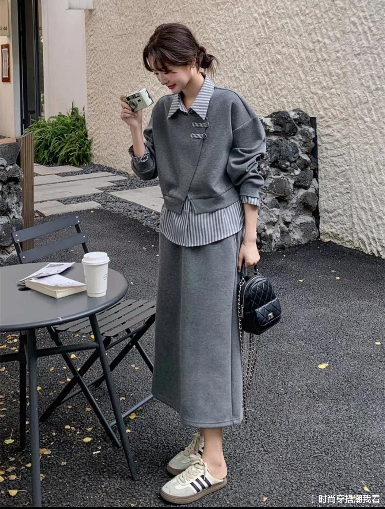 选择一件卡其色风衣,内搭灰色针织衫和黑色半裙。搭配一双棕色短靴和简约的项链,整体造型优雅大方又充满女人味。