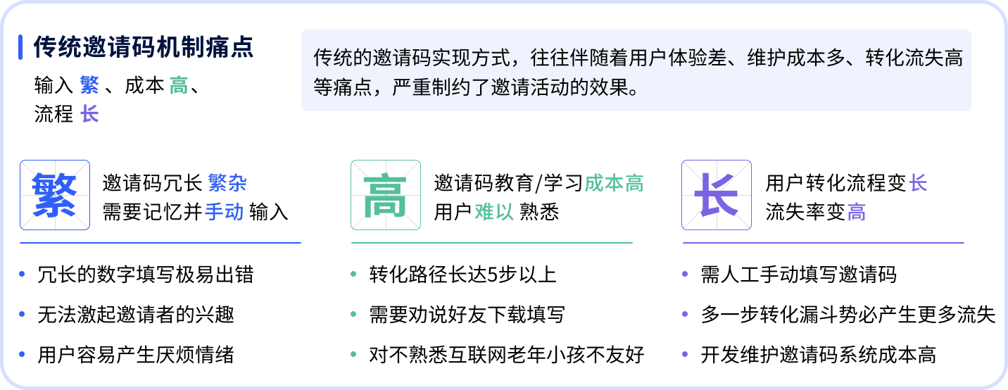 邀请机制是App用户增长和裂变营销中非常重要且必不可少的一种推广模式,而邀请码则充当着识别邀请来源、关联邀请关系、触发奖励机制的关键标识。然而,传统的邀请码实现方式,往往伴随着用户体验差、维护成本多、转化流失高等痛点,严重制约了邀请活动的效果。