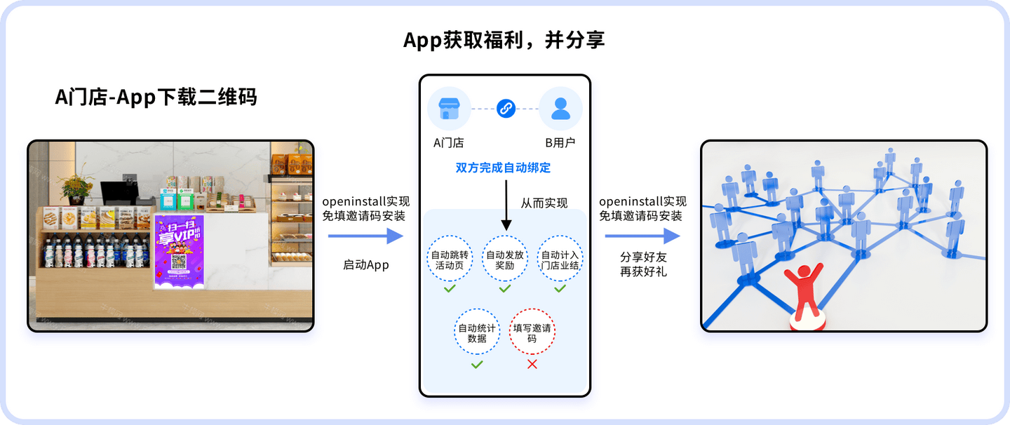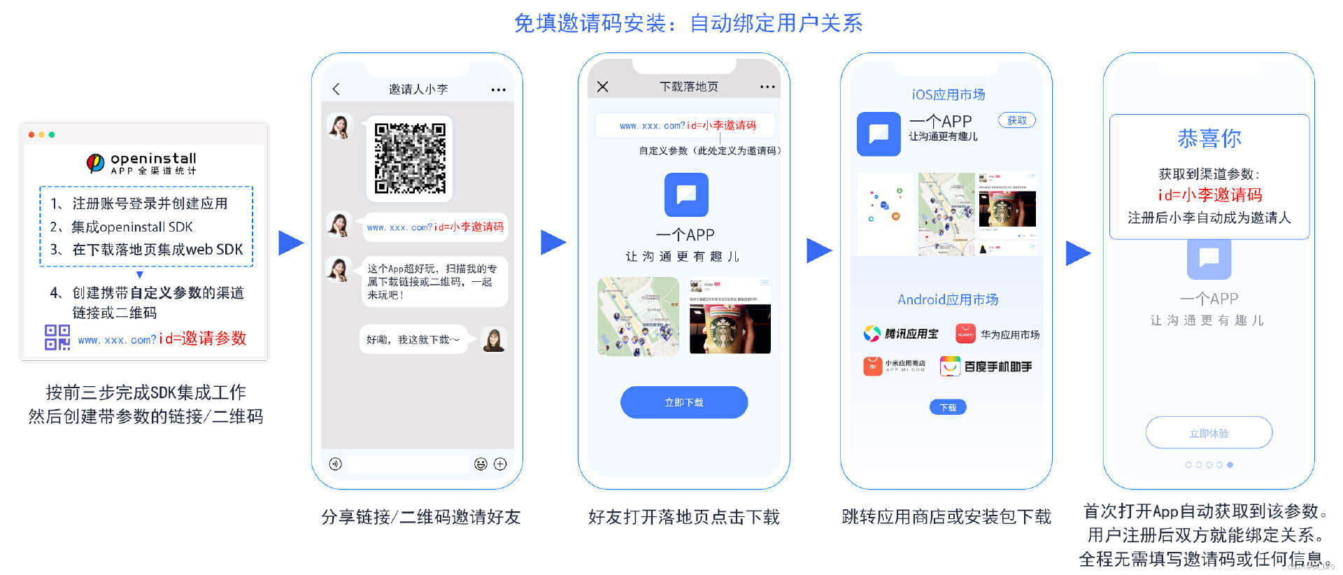 简单来说,A用户要推荐别人安装App,需要分享了一个邀请链接给用户B,链接上的落地页集成了openinstall的JS SDK,B用户通过链接进入落地页,触发了JS(比如页面上的下载按钮),此时A用户的邀请码参数上传到openinstall的服务器,B用户下载App之后,首次启动App会自动匹配来源的邀请参数,从而实现自动绑定用户关系。