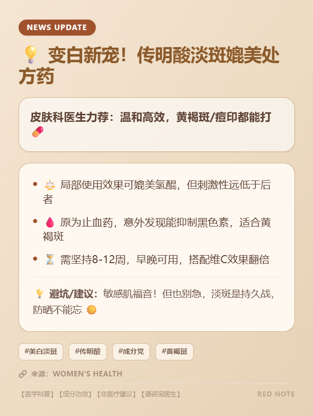 一句话结论:皮肤科专家推荐传明酸(TXA)作为温和高效的祛斑成分,有研究显示其效果可与一线处方药相当。为什么重要:在维C、壬二酸等传统淡斑成分之外,传明酸正逐渐走入护肤视野。其可口服可外用,兼具美白、安全、不刺激等优点,为色斑困扰女性提供新选择,也体现成分党对科学证据的追求。关键要点:-背景简介:传明酸原为止血药,通过抑制纤溶系统减少出血。偶然发现服药者皮肤提亮,由此拓展为美白用途。近年被添加于精华液和面霜中,用于治疗黄褐斑、炎症后色沉等。-功效证据:纽约皮肤科医生Lisa Akintilo称,部分研究指出局部传明酸淡斑效果可媲美氢醌这类金标准处方药,但刺激更小。她本人也使用TXA,称“皮肤更亮,泛着光泽”,周围人都有好评。-使用贴士:传明酸适合无法耐受猛药的人群,可早晚使用,与维C、果酸等联用协同淡斑。常见浓度2~5%,需坚持至少8~12周。除面部护肤,口服传明酸在皮肤科也用于顽固性黄褐斑治疗,但需医生指导。适用与避坑:适用于敏感肌、孕产期无法用强效药的色斑人群。需注意防晒配合,否则再好的美白也徒劳。敏感肌首次使用建议低频,监测有无皮疹等不良反应。传明酸虽安全但也非速效,不宜频繁更换或叠加过多淡斑产品,以免皮肤屏障受损。标签:传明酸 淡斑 美白成分 抗炎亮肤 色素沉着来源:Women’s Health杂志/美容编辑Katie Mogg(专家审稿:Brian Underwood)时间(PT):2025-12-10 13:21【实验数据】【科研转述】【非医疗建议】【非上市药物】【医疗问题请咨询医生】