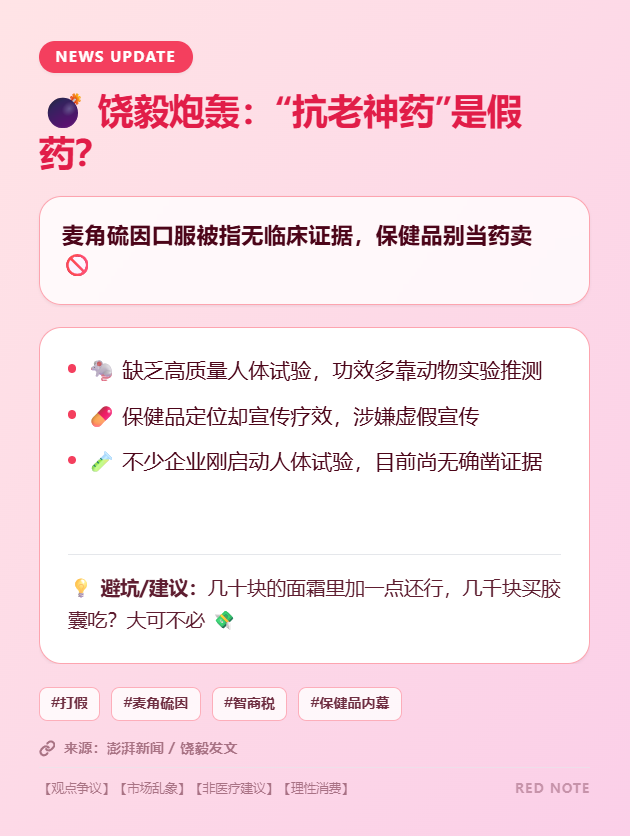 一句话结论:针对近年来风靡的抗衰网红成分麦角硫因,著名生物学家饶毅发文直指其为“假药”,因缺乏令人信服的人体试验数据,仅靠保健品名义蒙骗消费者。为什么重要:在资本热炒下,麦角硫因口服产品市场暴涨,但科研界的质疑敲响警钟。此事件凸显功效宣称必须建立在严格证据之上,也揭示保健品监管漏洞和大众易受误导的风险,对于整个功能性食品/补剂行业具有警示意义。关键要点:-网红补剂潮:麦角硫因是源自蘑菇的抗氧化剂,两年前开始在小红书等平台疯传可吃出“少女肌”,众多新锐品牌推出相关胶囊,价格高昂但销量火爆。2024年市场规模飙至8.2亿元人民币,同比增速超1000%。-缺乏实证:然而迄今缺乏高质量人体临床证据。功效多基于体外和动物实验推测。饶毅指出,“凡证据不足以批准为真药者即为假药”,口服麦角硫因尚无可靠数据支持抗衰效果。连国家药监局保健品注册中都无麦角硫因获批记录。-商家反应:某药企董事长曾赤膊上阵为麦角硫因胶囊代言,引争议。被批后公司辩称其定位膳食补充剂非药品,但并未正面拿出有效数据。饶毅质疑其罔顾伦理虚假宣传。目前一些企业已启动人体试验,试图在未来几年内提供口服有效性的证据。适用与避坑:面对各种号称“抗老神药”的保健品,消费者务必理性,不要被营销噱头裹挟。麦角硫因外用护肤尚可尝试,但口服若无医嘱不宜盲目长期服用,更不能替代正规药物治疗。监管层应加强电商平台此类产品的审核,杜绝夸大宣传和不当代言。标签:麦角硫因 抗氧化 保健品 科研打假 功能性补剂来源:澎湃新闻·趣解商业/张语格时间(PT):2025-06-09 00:42(话题发酵于2025-12初)相关条目:对应监管风险见风险红旗;其他炒作成分如NAD+/NMN类似面临证据缺乏挑战。