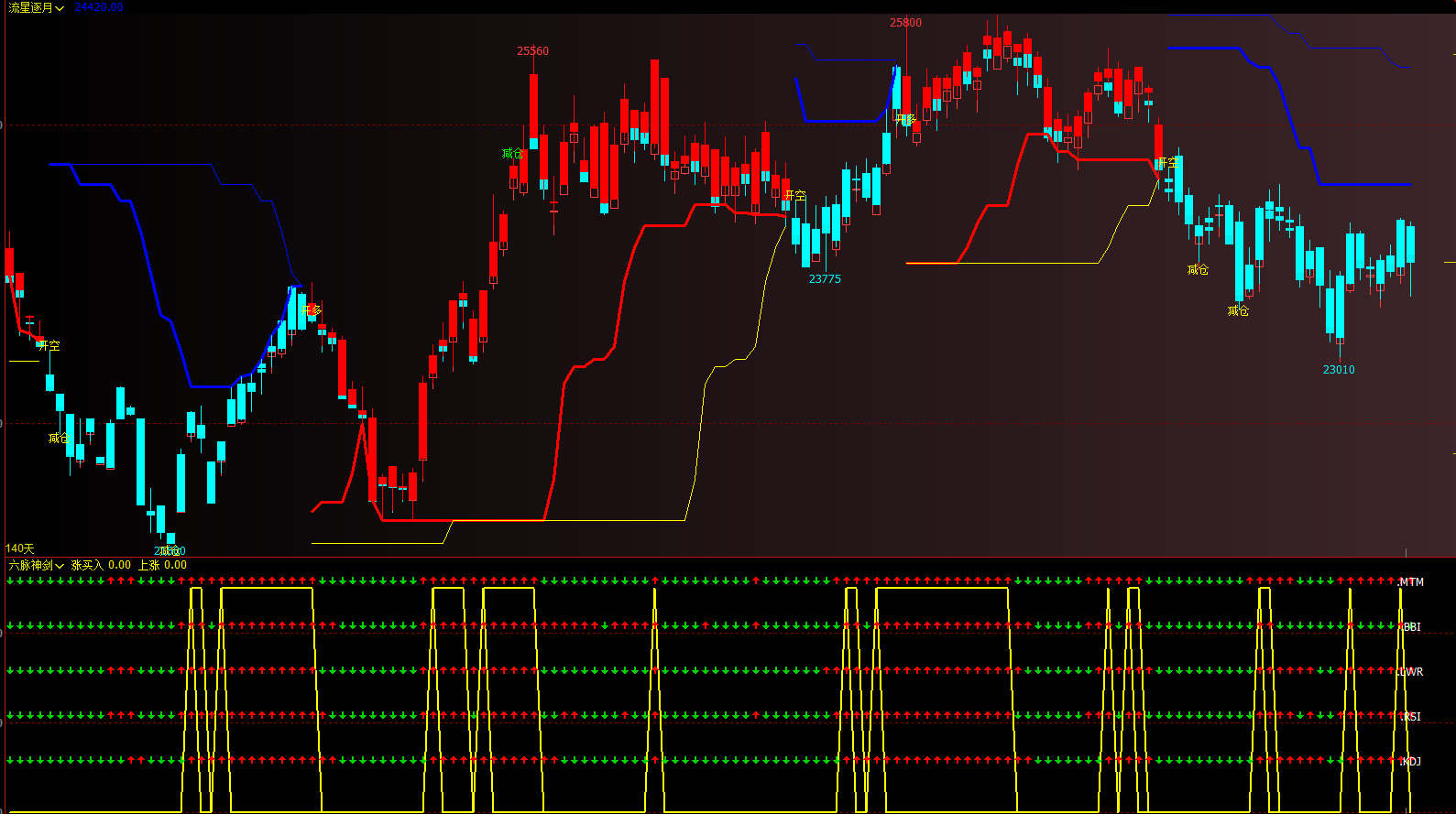 可视化设计方面,系统采用暗色系背景(0,0,0)-(61,37,41)渐变,搭配黄、蓝、红三色高对比度指标线,确保关键信号醒目易识别。K线实体通过STICKLINE函数实现多空分色显示,趋势强弱一目了然。
