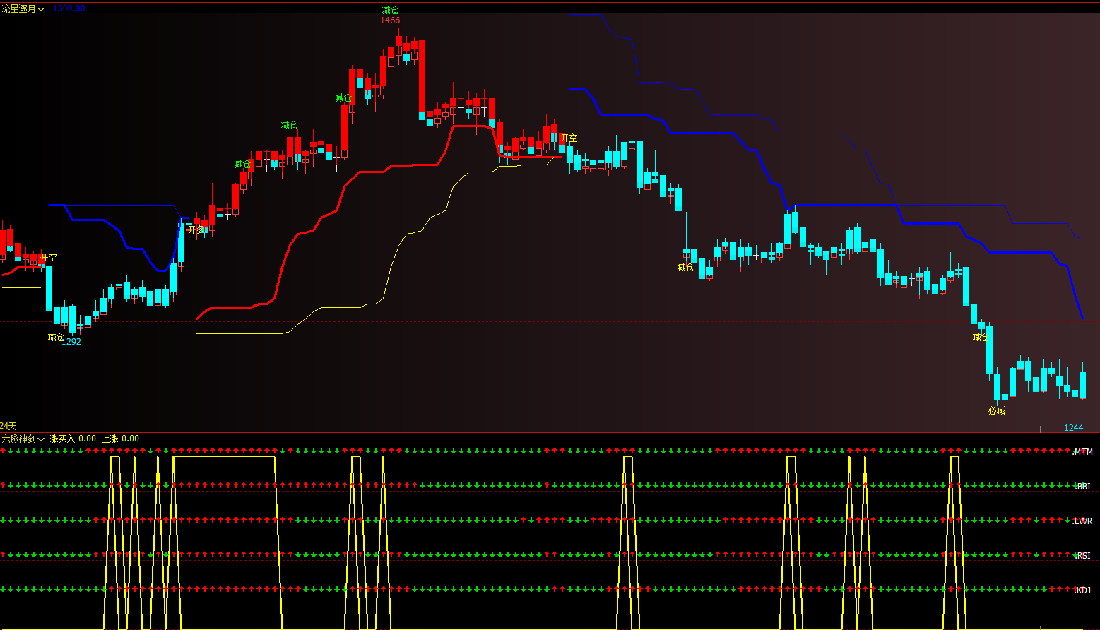 2. 三维空间定位:通过HHV/LLV函数构建的通道体系,结合K线实体着色规则(红色空头/青色多头),直观展示价格运行空间