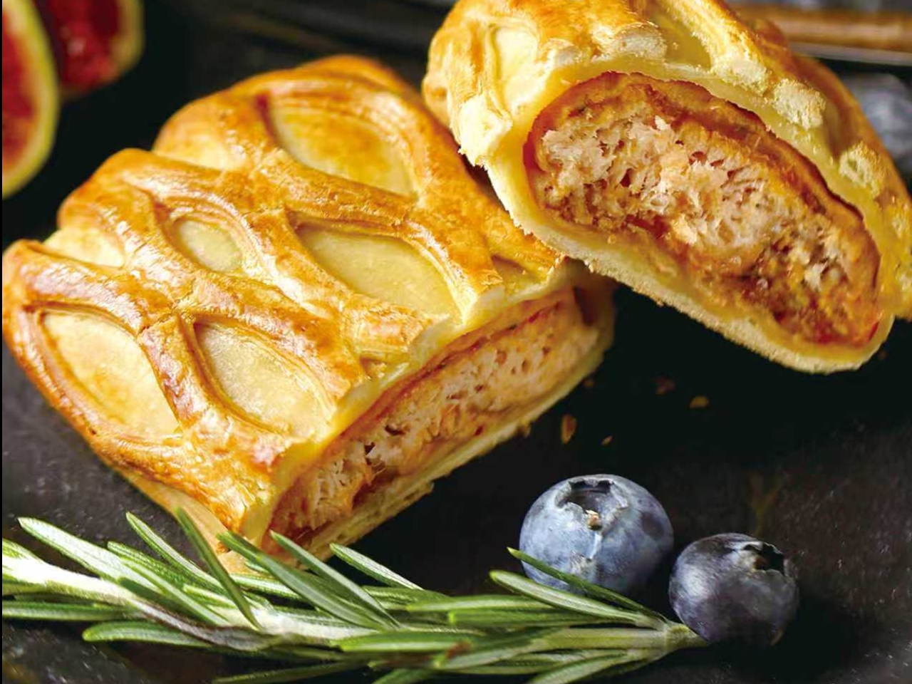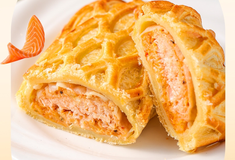 口感更是直接戳中味蕾!外层是48层起酥工艺打造的金黄酥皮,烤完后香酥掉渣,轻轻一碰就簌簌掉屑;内里包裹着细腻紧实的三文鱼,切开瞬间汁水迸发,搭配鲜香内馅,层次丰富到犯规。外酥里嫩的碰撞,既有深海三文鱼的鲜甜,又有酥皮的麦香,每一口都是舌尖盛宴。