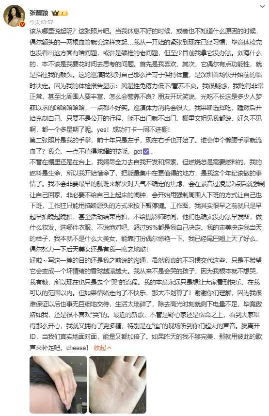 没人知道,这位笑着安抚观众的歌手,早已被健康问题困扰许久。今年8月,她曾晒出手掌脱皮流血的照片,坦言自己 “风湿性免疫力低下 + 营养不良”,连额头血管都会莫名突起,怀疑是颈椎老毛病引发的连锁反应。