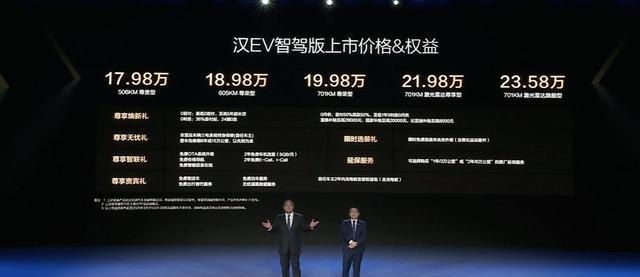 2025款比亚迪汉EV智驾版提供5款配置车型,分别为:506KM尊贵型、605KM尊荣型、701KM尊荣型、701KM激光雷达尊享型、701KM激光雷达旗舰型,售价17.98-23.58万元。