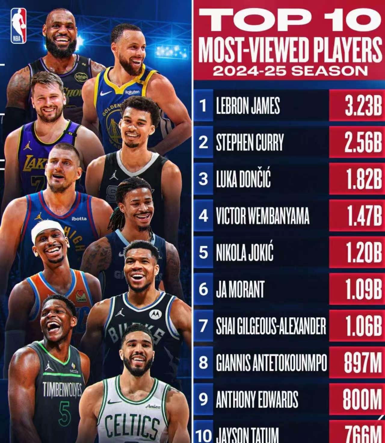 东契奇本赛季以18.2亿的浏览量排名第三,超越了备受期待的状元文班亚马。