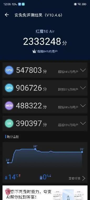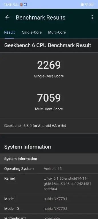 从跑分结果来看,红魔10 Air的安兔兔跑分达到了233万,在Geekbench6的测试中,红魔10 Air单核分数2269,多核分数达到了7059。这一成绩在骁龙8Gen3处理器中算相当出色。