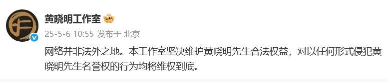 该道歉信发布后,黄晓明工作室转发回应:“网络并非法外之地。本工作室坚决维护黄晓明先生合法权益,对以任何形式侵犯黄晓明先生名誉权的行为均将维权到底。”