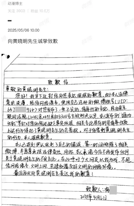 截至2025年5月6日,被告杨*已在涉案微博账号公开发布致歉信,向黄晓明先生公开致歉,目前正在履行赔偿款项的法律义务。
